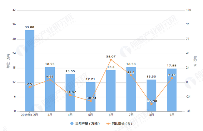 據國家統計局市場調查統計數據顯示,2019年8月江西省原鹽產量為13.33萬噸,同比下降35.98%,2019年9月江西省原鹽產量為17.88萬噸,同比增長7.13%。2019年1-9月江西省原鹽產量147.25萬噸,同比...