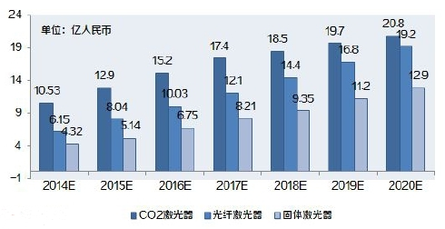 激光產業目前我國應用與激光醫療,激光加工等行業,其中材料加工,通訊,信息,醫學,測量與其他等領域各占12%,32%,12%,14%,20%,9%和1%。