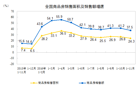 2016年1-11月份全國房地產開發投資和銷售情況