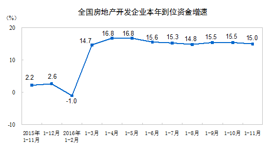 1-11月份,房地產開發企業到位資金129484億元,同比增長15.0%,增速比1-10月份回落0.5個百分點。其中,國內貸款19199億元,增長3.1%;利用外資132億元,下降49.0%;自籌資金44772億元,增長0.3%;其他資金65381億元,增長33.4%。在其他資金中,定金及預收款37246億元,增長30.5%;個人按揭貸款21970億元,增長49.3%。
