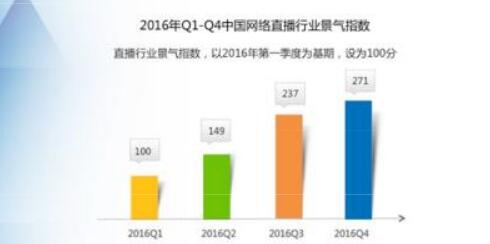 2016年我國的網絡直播行業實現了全年持續增長,以一季度100為基數,第四季度中國網絡直播行業景氣指數為271,環比增長14.34%,在經歷了前三季度的爆發式增長之后,中國網絡直播行業步入平穩增長期。