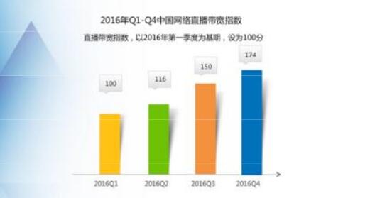 具體來看,延續前三季度網絡直播帶寬指數的持續增勢,2016年第四季度中國網絡直播帶寬指數為174,環比增長16%,與二季度的環比增速持平。