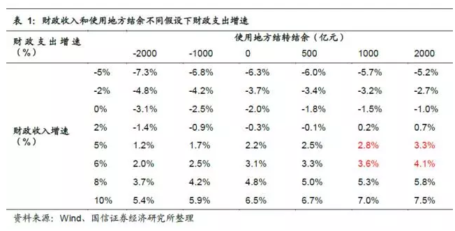 根據前述分析,決定全年最終財政支出數量的變量有三個:財政收入、預算赤字、中央和地方結余的使用。這里我們對不同情況下2017年的財政支出增速進行展望。我們假設2017年名義GDP增速在10%,假設預算赤字占名義GDP的比重為3%(2016年按已經公布的名義GDP和計算為2.9%),則計算出2017年預算財政赤字為24500億。